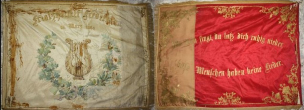 1864 wurde die erste Vereinsfahne angeschafft. Sie ist heute noch gut erhalten und zeigt auf der einen Seite auf weißem Grund eine goldene Lyra. Die Rückseite ist purpur grundig und trägt den bekannten Spruch: